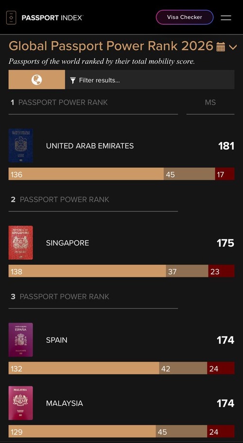 Berdasarkan data terkini, Malaysia berkongsi kedudukan dengan Sepanyol di tangga ketiga dunia dengan skor mobiliti sebanyak 174, sekali gus mengukuhkan statusnya sebagai antara pasport paling berkuasa di dunia.